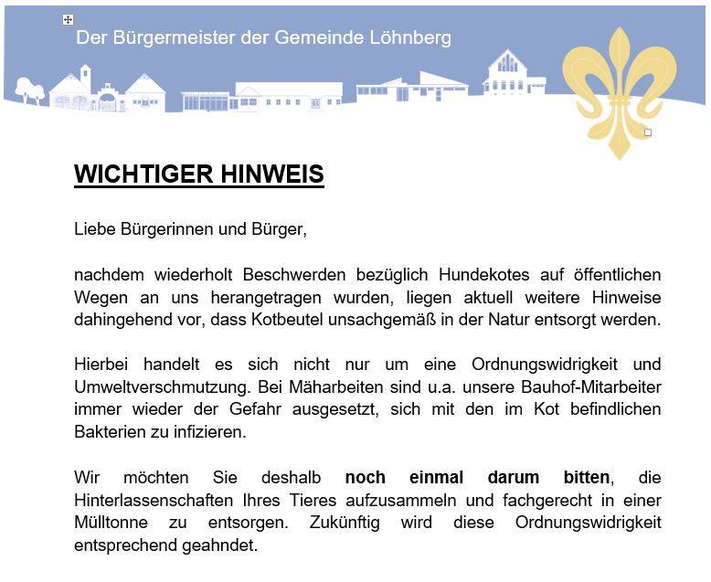 nachdem wiederholt Beschwerden bezüglich Hundekotes auf öffentlichen Wegen an uns herangetragen wurden, liegen aktuell weitere Hinweise dahingehend vor, dass Kotbeutel unsachgemäß in der Natur entsorgt werden.