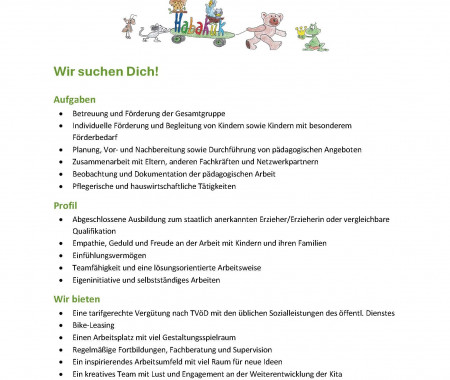Staatlich anerkannte/r Erzieher/Erzieherin in Teilzeit für den U3 Bereich / Krippenbereich