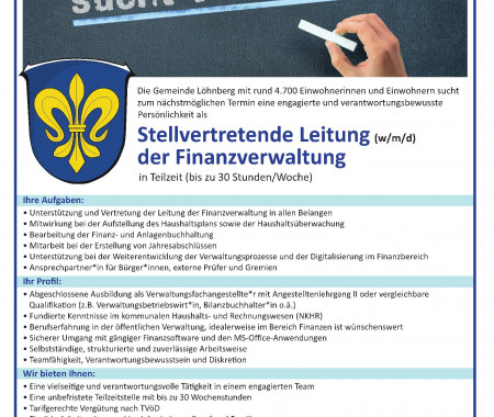 Die Gemeinde Löhnberg mit rund 4.700 Einwohnerinnen und Einwohnern sucht zum nächstmöglichen Termin eine engagierte und verantwortungsbewusste Persönlichkeit als
